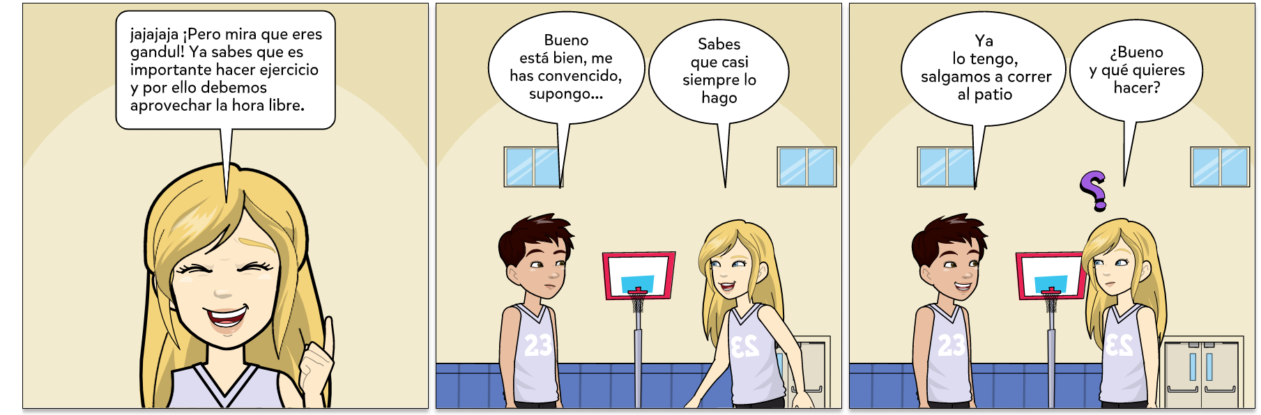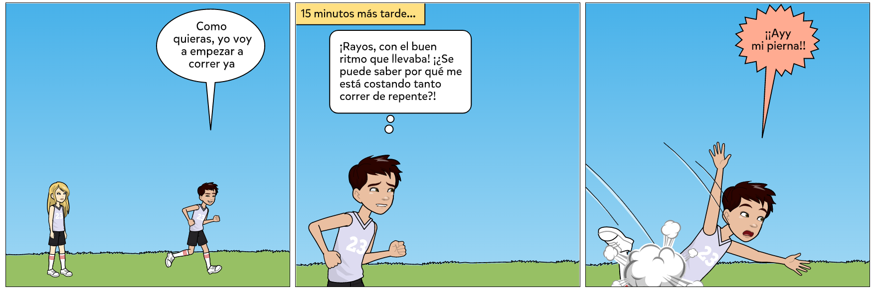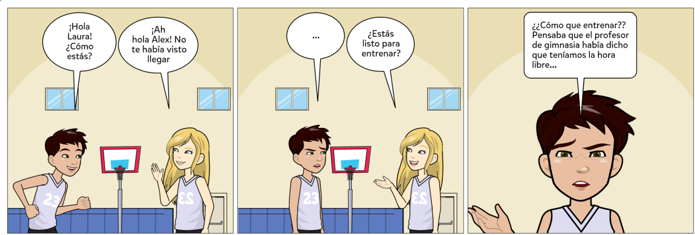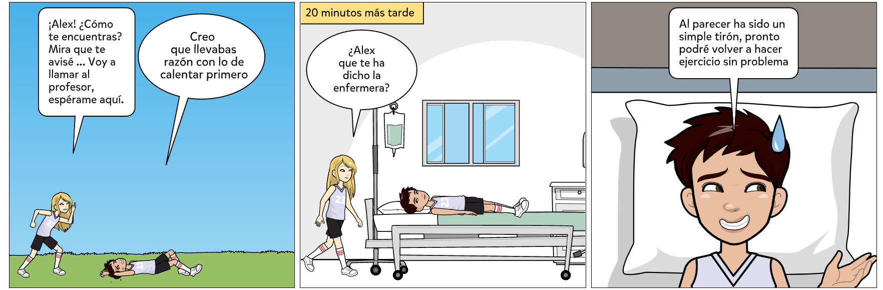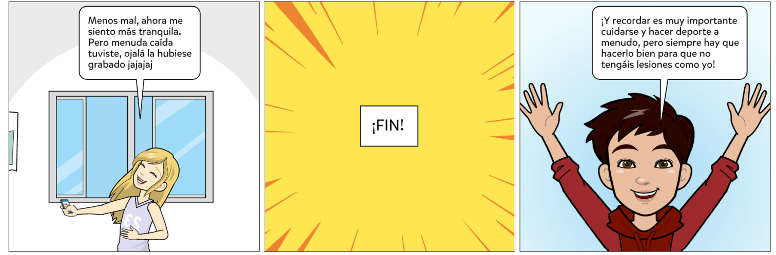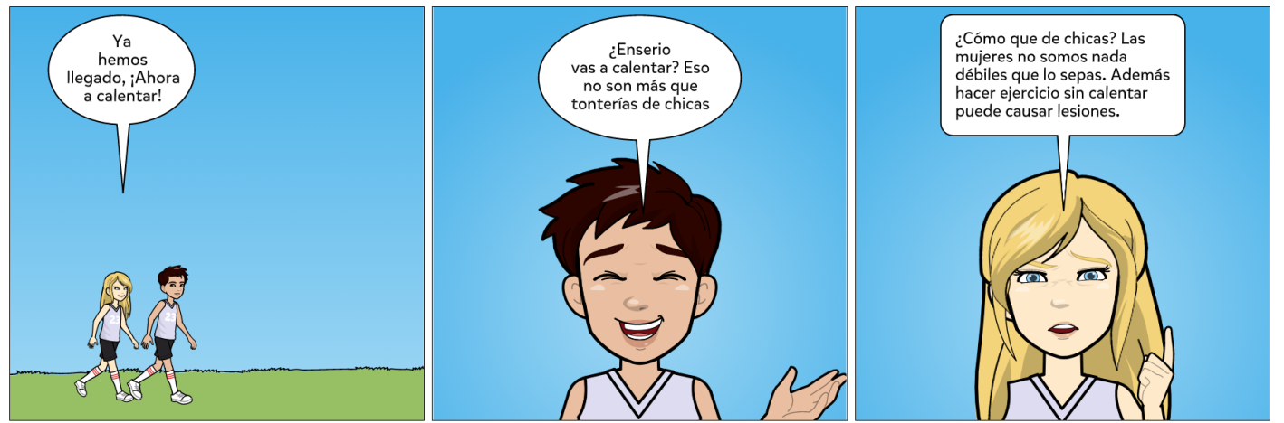 Para esta actividad, haciendo uso de la aplicación Pixton Comics ( que es una herramienta web 2.0), hemos realizado nuestro propio cómic, que trata el tema del deporte y su práctica correcta. Para ello hemos creado a dos simpáticos personajes, Laura y Alex, que nos enseñarán que para no sufrir lesiones al realizar deporte, es necesario prepararse previamente y calentar de forma adecuada.